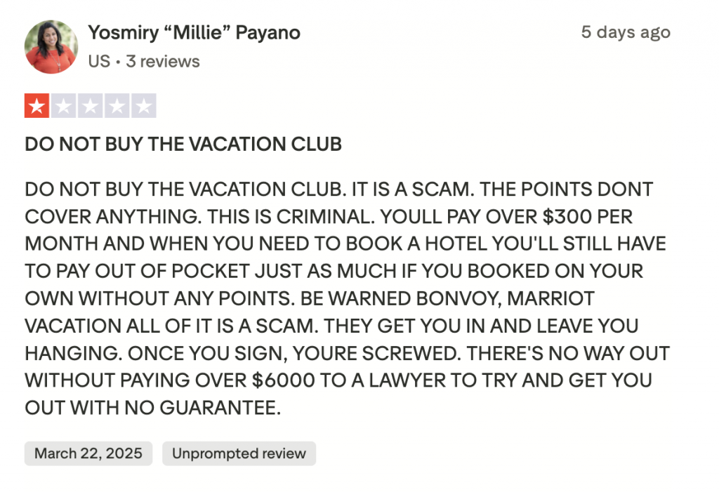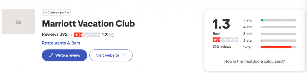 We can take a look around the web to find some examples of various complaints people have made. Let’s start by visiting Trustpilot. Here, the Marriott Vacation Club earns a total score of 1.3 stars, based on nearly 400 reviews.